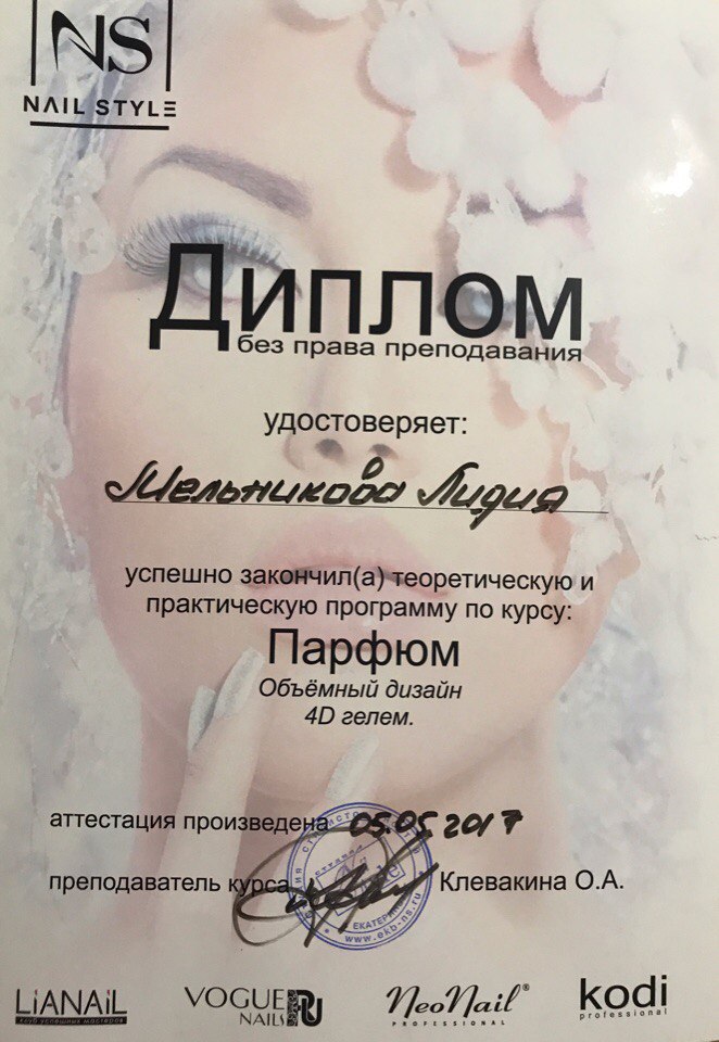 Ну у вот! Он! И они! То есть диплом и знания! Я довольна, а значит, девочки, довольны будете и вы! Ведь дизайн с такой лепкой (не путайте с акриловый лепкой, это другое!) это всегда очень изящно, женственно и безумно красиво! Объёмный дизайн это класс!!! Не могу сказать, что мне этот курс дался легко, было сложновато... Особенно сегодня, когда по программе шли сложные композиции из цветов...Но вы ведь у меня терпеливые)))))) С вашей помощью я все освою и все отработаю тысячу раз!!!
