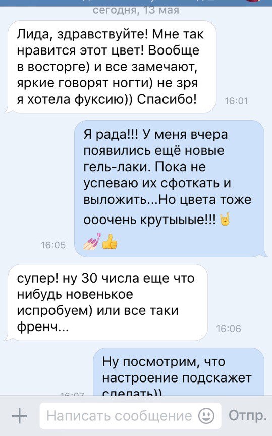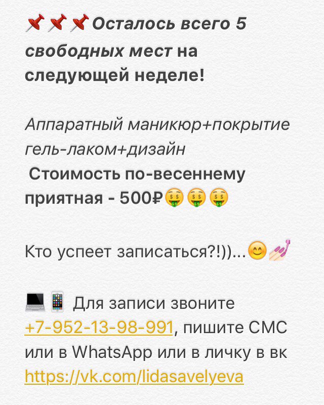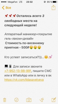 Девочки, каждый раз перед записью (ориентировочно за сутки!!!) я отправляю вам так называемую СМС-напоминалку. До вечера того дня, когда было отправлено СМС, я жду от вас подтверждения о том, что вы приедете. Отправить подтверждение Вы можете любым способом - хоть ответом на СМС, хоть звонком, хоть сообщением в ЛС или в WhatsApp...Вообщем, хоть как) А теперь о не совсем приятном... Без подтверждения я могу на ваше место записать другого человека или вовсе заняться своими делами) Прошу понимания и без обид)))