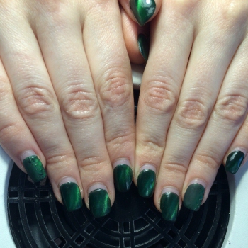 Кошачий глаз...Жаль, что камера не может передать весь блеск этого маникюра) P.S. Может показаться, что указательный пальчик на правой руке обработан плохо, но нет)))) Зона кутикулы от природы/какого-либо удара и многих др причин бывает неправильной формы...