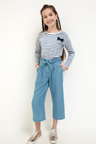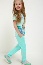 Спортивные трикотажные брюки, на резинке по низу брючин. Пояс на эластичной резинке и кулиске с яркими шнурками. Прорезные карманы по бокам.