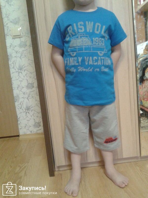 Второй комплект у меня был костюм с серыми шортиками, мягкий очень понравился, пухляку не подойдет, футболка узковатая, брала размер 4-5 , в самый раз, ходим сейчас до лета наверное футболку перерастем, а шортики хорошие с запасом.
