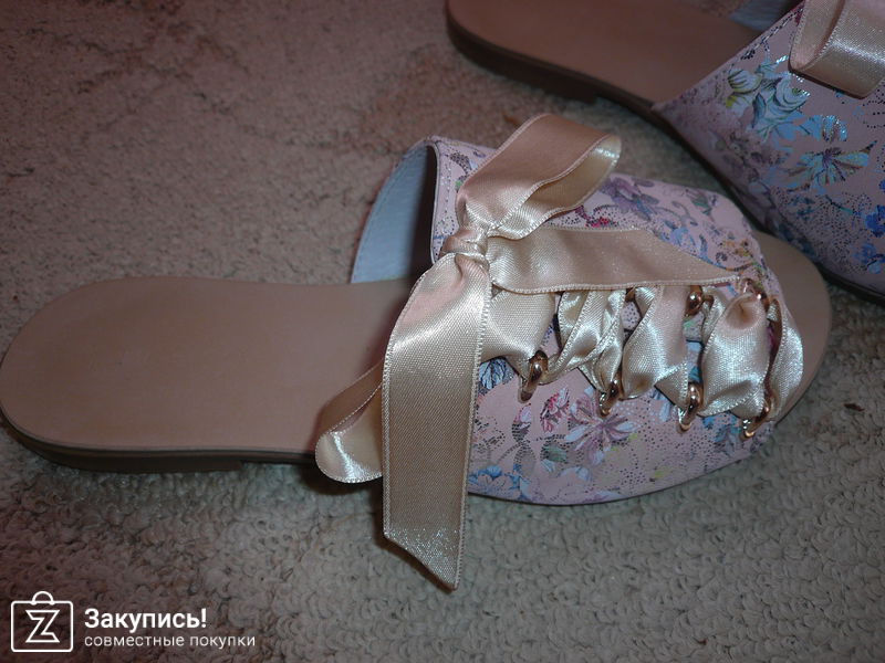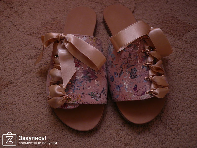 Брала шлепки из розовой кожи с принтом, украшенные лентами, размер 39. Перестаралась, так как можно было легко брать 38.