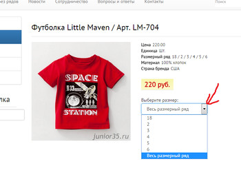 чтобы увидеть какие размеры доступны к заказу, открываем описание товара и нажимаем выбрать размер фото кликабельно