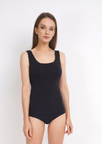 Майка женская из эластичного хлопкового полотна. Широкая бретель. В боковом шве фирменный жаккардовый логотип.— Описание у На сайте поставщика