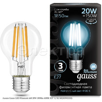 Лампа Gauss LED Filament А60 20W 1850lm 4100К Е27 1/10/40(102902220)