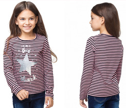 Футболка для девочки выполнена из эластичного хлопкового полотна в контрастную полоску. Спереди декоративный принт с глиттером.