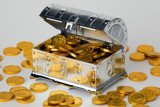 Золотой сундук. Конфеты в виде монеток из натурального темного шоколада