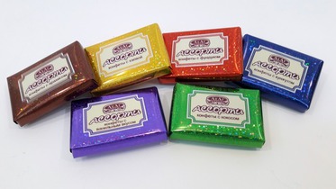 Конфеты куполообразной формы, с комбинированной начинкой, со вкусами черной смородины, клюквы, яблока, клубники, апельсина.