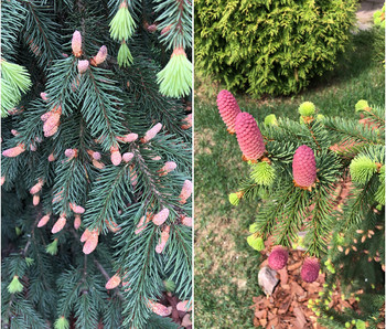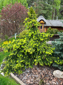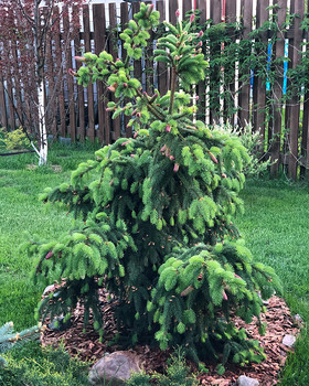 Скорость роста - 15-30 см в год. Может расти кустом, без выраженного лидера. Её характерной чертой являются большие шишки, необычным образом расположенные на концах побегов, весной красного цвета, зрелые - светло-бурые, свисающие вниз. Шишки появляются даже на молодых 3-5 летних елочках. В целом ель имеет вид невысокого, 3−4 метра деревца, с ширококонической кроной, ветки которой демонстрируют тенденцию склоняться к земле. Таким образом, растение приобретает слегка «плакучую» форму. Нижние ветки стремятся лечь на землю, вытягиваясь по её поверхности в разные стороны.