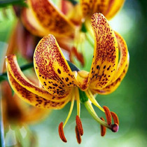 МАХРОВЫЕ цветки оранжевого цвета с пурпурным крапом, чалмовидные. , H-110см