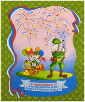 Полотенце вафельное 35010 - 1 ДЕНЬ ЗАЩИТНИКА ОТЕЧЕСТВА - солдат с детьми р-р 50х