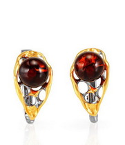Стильные серьги-гвоздики из позолоченного серебра и вишнёвого янтаря