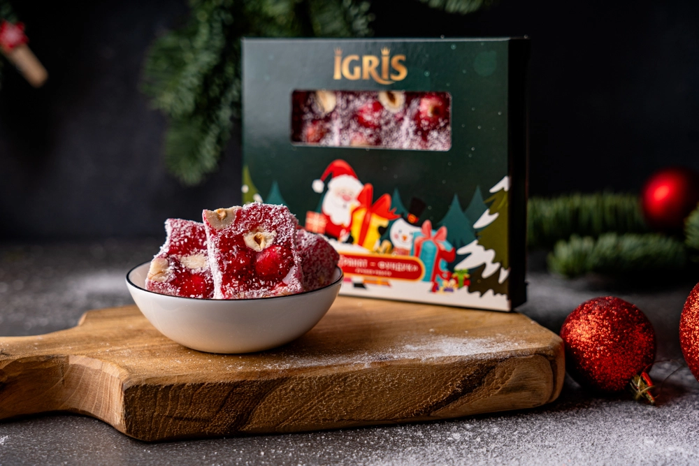 Начинка: миндаль, кешью жареный, ядра фисташек, пекан, вишня сублимированная, клубника сублимированная, инжир сублимированный, апельсин сушеный, санго сублимированный.
