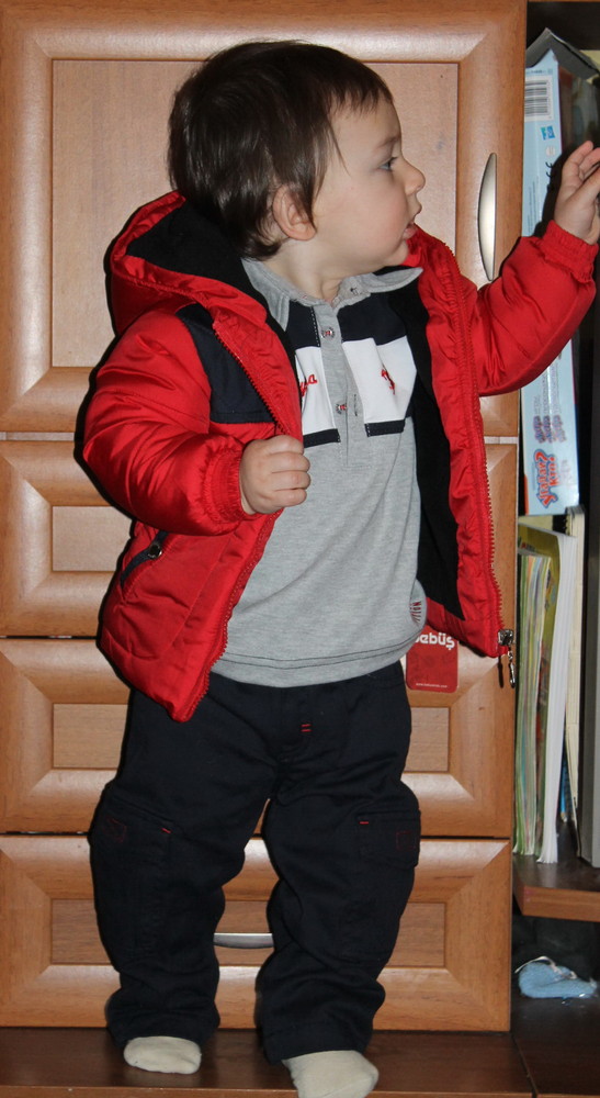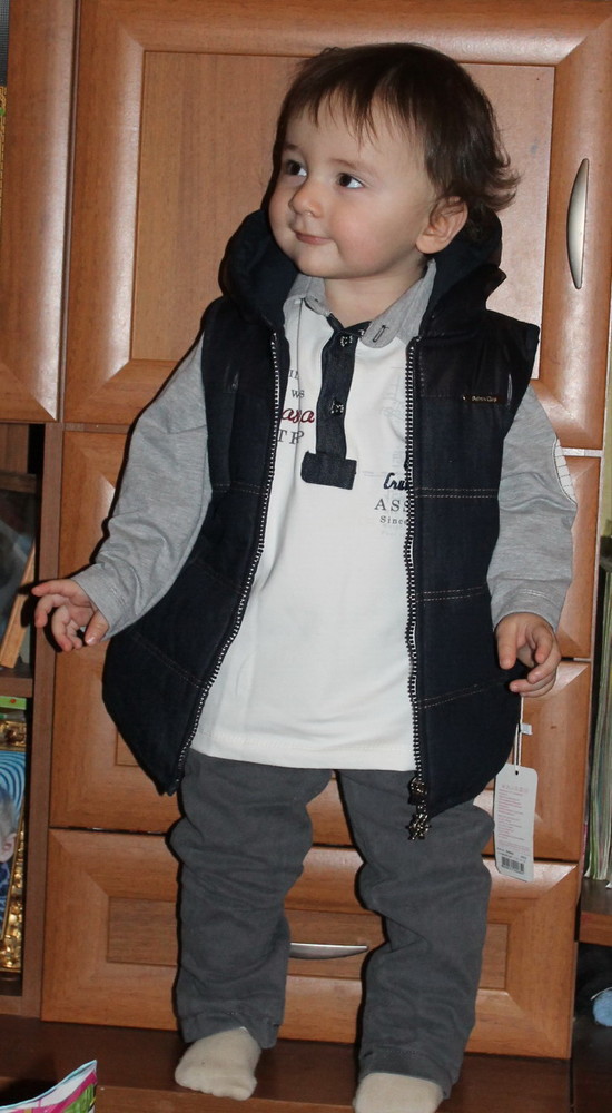 Модель моя ростом 82-84,размер комплекта с курткой 1,5 года,а с жилетом 2 года. Первый: только,только,достаточно плотно в объёме куртка,хотя джентельмен мой не пухляк, кофточка свободна,брючки с запасом,но плотнее кофты не одеть под куртку. Куртка очень плотно застёгивается на этой.По качеству супер,утеплитель и внутри как флис что ли. На погоду до -5,не холодно,брючки тоже на подкладе тёпленькие.