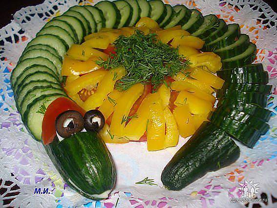 Режем маслины на 4 части и сверху укладываем на салат. салат убрать в холодильник на 12 часов, перед подачей на стол по краям салата разложить чипсы в форме подсолнуха и в серединку посыпать тертый желток.