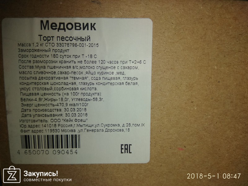 Брали Медовик. Написанный состав на коробке понравился- практически натуральный. На вкус- я не очень поняла его, жирноват, суховат, как будто обезвожен. После разморозки уже через 20 минут можно было есть - как будто его ничего не берёт))) Ирине- спасибо.