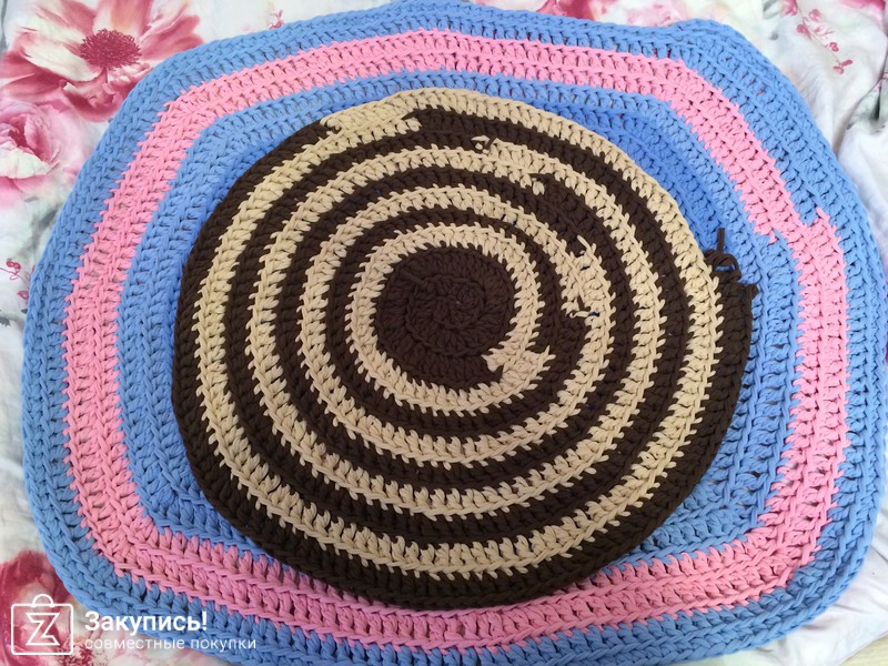 я в прошлый раз брала по моточку бежевого, шоколадного, сакупа и небесный вроде. Решила деткам коврики в их комнаты связать, бежего-коричневый в диаметре 63 см ушли по моточку, еще взяла по одному чтобы закончить его. На розовый еще докупала в другом месте 3 мотка, по цвету не попала, но ничего дочке понравился. Т.е. на него ушло 5 мотков и размерах он 80на 100 см Вяжу без схему стобиком с одним накидом, крочком 10