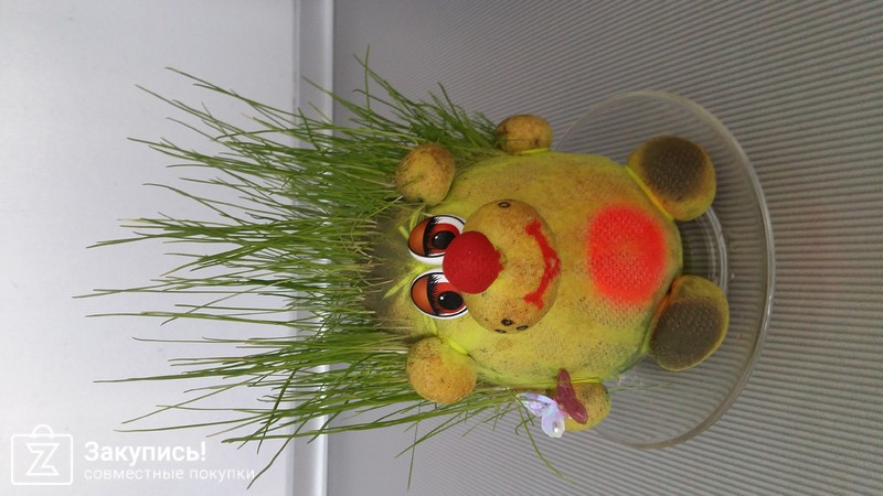 Оригинальный подарок, брала белого мишку, когда намок на белого мишку мало чем стал походить, просто смешной зверек. Травка быстро появилась, но после стрижки как-то хуже (у нас лично) растет. И на спинке семена не равномерно распределены.