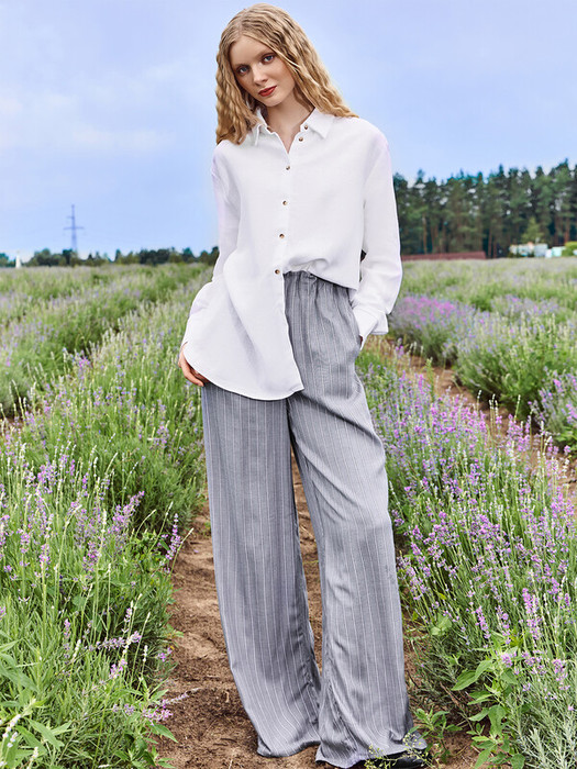 Женские брюки прямого свободного силуэта — это идеальный выбор для тех, кто ценит непринужденный стиль и комфорт в повседневной жизни. Средняя посадка обеспечивает удобную посадку по талии, а эластичный пояс мягко фиксирует изделие, подстраиваясь под индивидуальные особенности фигуры без ощущения сдавленности. Боковые карманы, спрятанные в швах, добавляют функциональности, не нарушая лаконичность дизайна. Нижние срезы аккуратно обработаны швом в подгибку, что придает завершенный вид и способствует сохранению формы изделия после стирок. Изготовленные из вискозы, брюки отличаются мягкостью, легкостью и хорошей воздухопроницаемостью. Ткань красиво драпируется, создавая плавные линии и ощущение легкости при движении. Универсальная модель, которая отлично сочетается с футболками, рубашками или свитшотами — прекрасный базовый элемент как для домашнего образа, так и для прогулок в теплую погоду.