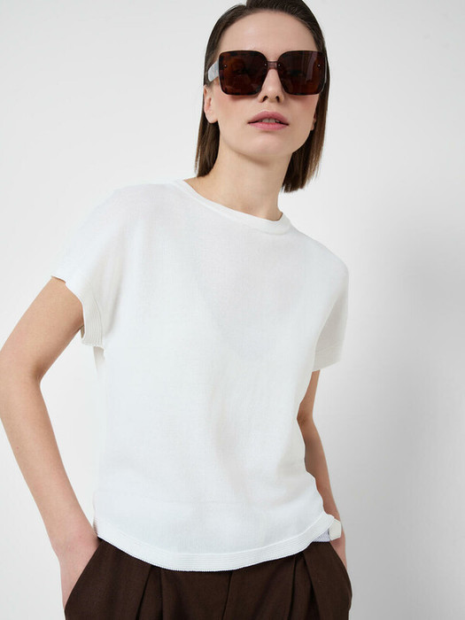Женский джемпер. Модель свободного кроя, средней длины, выполнен из тонкого мягкого трикотажа. У изделия круглая горловина, короткие рукава и прямой низ.
