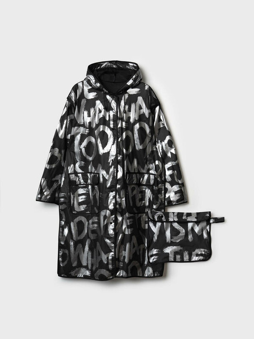 Укороченный женский плащ-дождевик с серебряным шрифтовым принтом. Капюшон с утяжкой. Застежка на кнопки. Материал  ЭВА. Без подкладки. Модель имеет спереди два накладных кармана с клапаном. Добавлена петелька под капюшоном с внешней стороны, чтобы остальные вещи на вешалке не намокали. Сзади есть светоотражающая полоска. Идеально подходит для парного образа мама-дочь, так как такая модель есть в детских размерах.  В комплекте идет непромокаемая сумочка.