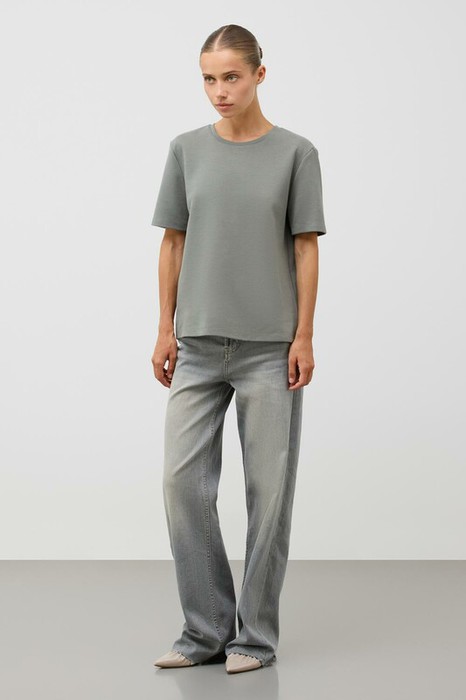 Базовая футболка из премиального трикотажа DOUBLE FACE.  Трикотаж прошел особую обработку силиконом, что придает ему легкость и шелковистость текстуры. Имеет классический круглый вырез и удобный прямой крой.