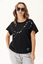 Футболка прямого силуэта из высококачественного гребенного хлопка с добавлением эластана. Нежная и струящаяся фактура полотна за счет специальной обработки soft touch дает ощущение комфорта в жаркие летние дни. Мягкий на ощупь принт выполнен из водных красок, что обеспечивает устойчивость к многократным стиркам.