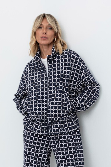 Укороченная трикотажная куртка на молнии с карманами и кулиской по низу. Произведена из мягкого набивного трикотажного футера. Спущенные рукава и манжеты на резинке добавляют объем.
