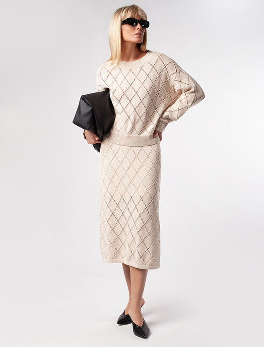Юбка прямого силуэта выполнена узорной вязкой из мягкой хлопковой пряжи. Тонкий ажурный трикотаж идеально подходит для теплой весны и лета, в нем будет комфортно и не жарко. Модель дополнена разрезом на ноге и подкладкой из трикотажного полиэстера, такой материал гарантирует формоустойчивость юбки и скрывает излишнюю прозрачность. Сочетается в костюме с джемпером D33.007 и D39.629