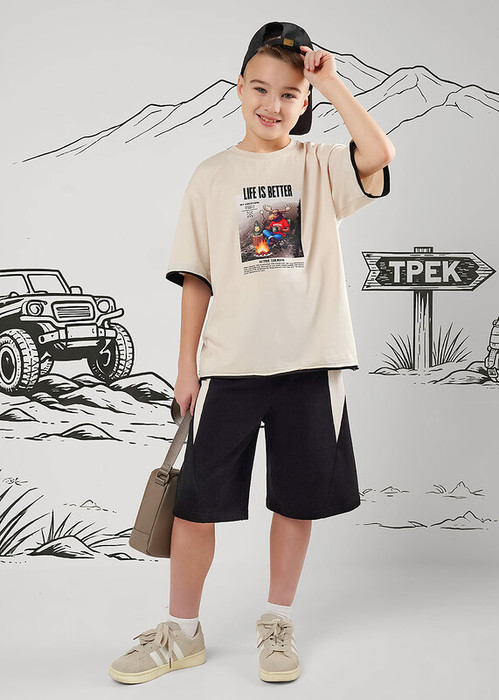 Стильная футболка оверсайз из 100% хлопка для мальчика с эластичной горловиной обеспечивает комфорт. Оригинальный принт на передней части привлекает внимание. Характерной деталью модели являются необработанные двойные края по низу изделия и рукавам.
