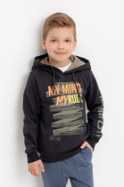 Свитшот с воротником для мальчика. Изготовлен из высококачественного петельчатого футера. В составе 80% натурального хлопка и 20% полиэстера, при этом полиэстер ввязан внутрь по особой технологии и не соприкасается с кожей. Манжеты и пояс выполнены из эластичного полотна. На груди короткая застёжка на молнию. Оригинальный рисунок выполнен из стойких текстильных гипоаллергенных красителей. Изделие сохраняет цвет и форму после многократных стирок.