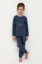 Пижама для мальчика из натурального хлопка. Джемпер с длинными втачными рукавами и брюки с эластичной резинкой в поясе. Мягкие манжеты по низу брюк сделаны из материала в рубчик. Оригинальная набивка и принт выполнены из стойких текстильных гипоаллергенных красителей. Изделие сохраняет цвет и форму после многократных стирок. Все трикотажные полотна производятся в соответствии с нормами швейцарского сертификата ЭкоТекс.
