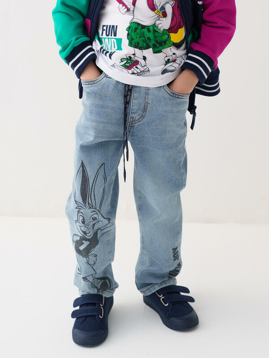 Детские джинсы из плотного голубого денима для мальчика. Модель выполнена в прямом крое с удобной посадкой и эластичным поясом, дополненным шнурком. Спереди два кармана, сзади – два накладных. Низ брючин аккуратно подогнут и отстрочен.