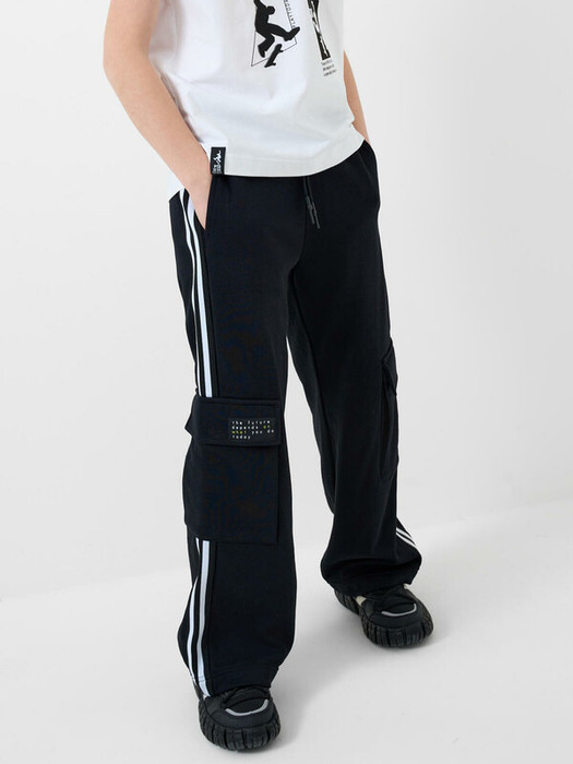 Широкие спортивные брюки для мальчика подростка. Модель из хлопкового трикотажа футер без начеса. Пояс на резинке дополнен внешним шнуром для регулировки объёма. Брюки оформлены в контрастной чёрно-белой гамме с лампасами по бокам и текстильной нашивкой с объёмным принтом. На бедрах расположены удобные боковые карманы и объёмные карманы-карго на липучке.