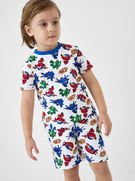 Детская пижама для мальчика. Состоит из футболки с короткими рукавами и шорт. Модель выполнена из мягкого, хлопкового трикотажа и украшена ярким принтом с персонажами "Super Wings". Пояс на шортах на резинке с регулировкой.