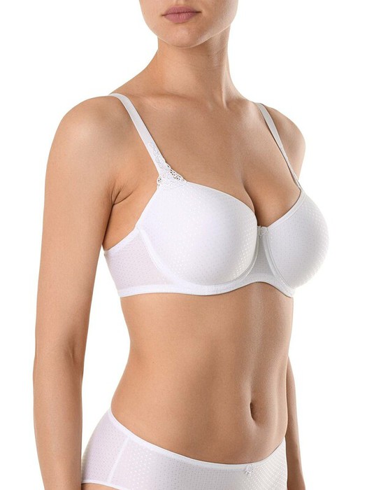 Бюстгальтер серии VOYAGE отличается чистотой линий и исключительным комфортом. Выполненный из полотна с деликатным жаккардовым рисунком «в горошек» и украшенный аппликациями макраме, бюстгальтер поможет создать одновременно простой и утонченный образ. В бюстгальтере используется «дышащий» материал spacer. Преимущества модели:- формованная чашка spacer, на каркасах;- чашка покрыта жаккардовым полотном;- вышитые аппликации макраме. - абсолютный комфорт на протяжении всего дня.