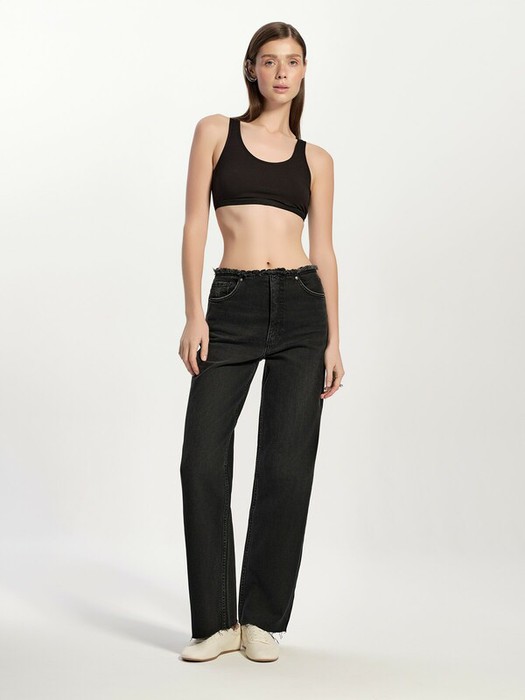 Чёрные джинсы wide leg средней посадки с мягкой бахромой по верху изделия станут оригинальной основой для ваших стильных образов. Благодаря широкому крою брюк и удобной посадке модель не сковывает движения и прекрасно вытягивает силуэт.