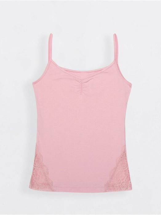 Топ женский из однотонного трикотажного полотна. По верхнему краю переда (по центру) -декоративная сборка, внизу, по бокам - декоративные кружевные вставки. Верхний срез изделия, проймы и бретели окантованы узкой бейкой.
