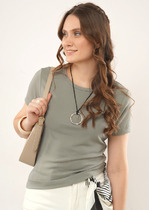 Хлопковая футболка свободного силуэта из трикотажного полотна кулирка. Горловина круглой формы. Свободу движений гарантируют спущенная линия плеча и углубленная пройма. Рукава широкие, чуть выше локтя. Стильная модель!