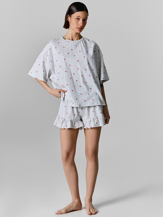Комплект состоит из джемпера (592666) и шорт (592609). Джемпер прямой, свободный (оверсайз). Горловина круглая с обтачкой из основного полотна. Шов втачивания обтачки по спинке закрыт бейкой из основного полотна. Рукава втачные, короткие, широкие. Линия плеча спущена. Нижний срез джемпера и рукавов обработан швом вподгибку. Шорты свободного силуэта, укороченные, с посадкой на талии. Пояс цельнокроеный с эластчиной тесьмой внутри (внутр. 30мм 30RV). По низу шорт рюши, обработанные на микрооверлоке.