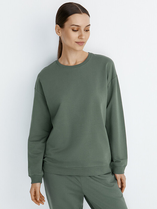 Женский свободный свитшот с длинным рукавом и круглым вырезом. Горловина обработана обтачкой из материала кашкорсе.