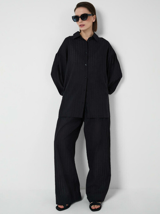 Легкий женский хлопковый костюм. Рубашка свободного прямого кроя с застежкой на пуговицы. Классический воротник и разрезы по бокам. Манжеты на резинке. Широкие брюки палаццо на резинке со шнурком для регулировки. Удобные боковые карманы.