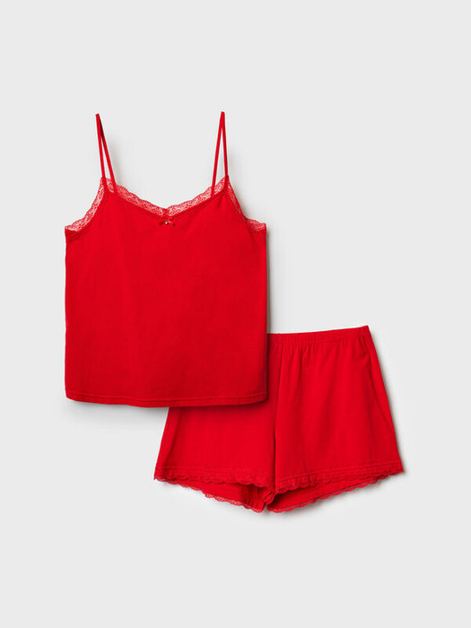 Женская пижама. Комплект состоит из майки и шорт, выполнен из мягкого хлопкового трикотажа. Майка с регулируемыми бретелями украшена кружевом по вырезу горловины и декоративным бантиком по центру. Шорты короткие, свободного кроя, с комфортным эластичным поясом и кружевом по нижнему краю.