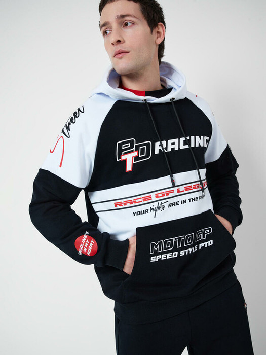 Худи мужское оверсайз. Выполнено из хлопкового футера без начеса. На груди и рукавах — крупный логотип и надписи, вдохновлённые мотоспортом. Капюшон регулируется шнурком, а на передней части расположен удобный карман-кенгуру. Манжеты и низ изделия выполнены из эластичного риба, что обеспечивает комфортную посадку. На правом рукаве — яркий силиконовый ярлык. Можно составить family look c детским вариантом аналогичного дизайна.