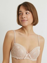 Бюстгальтер формы Padded bra с мягкими чашками, на каркасах, с боковой поддержкой из поролона и боковыми корсетными вставками, выполнен из нежного кружевного полотна и сетки в горошек. Регулируемые бретели украшены игривыми воланами. Бретели не отстегиваются. Застежка на 2 крючка и 3 ряда петель.