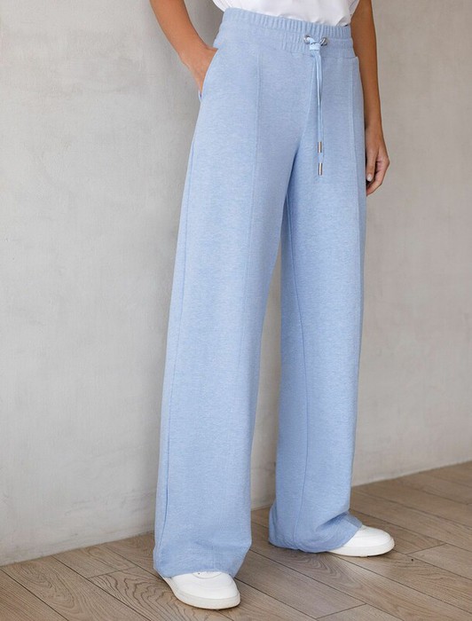 Брюки прямого кроя с удобным эластичным поясом на резинке и карманами по бокам выполнены из премиального футера-двухнитки. Наличие эластана в составе гарантирует комфорт и долговечность изделия, материал хорошо пропускает воздух, позволяя телу дышать.. Эти уютные брюки нежного цвета макиато с эффектом меланж созданы для вашего комфорта. Свободный прямой крой обеспечивает свободу движений и максимальное удобство в любых ситуациях, поэтому они подойдут и на большие размеры, а так же на высокий или низкий рост. Фигура подчеркивается, а силуэт визуально вытягивается за счет кроя палаццо и застроченных декоративных стрелок. Вы можете создать стильный образ на каждый день в сочетании с джемпером D49.139 и бомбером D49.141.  В повседневных трикотажных брюках вы будете чувствовать себя комфортно и уверенно, наслаждаясь каждым моментом дня.
