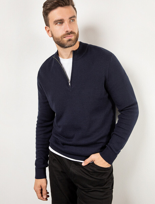 Для изготовления светло-синего джемпера с воротом, застегивающимся на молнию, использовали мягкий трикотаж, связанный из премиального хлопка с добавлением акрила. Двуслойное жаккардовым плетение, вязка с фактурой типа «пике», благодаря чему джемпер имеет среднюю плотность, эластичноть и, при этом, формоустойчивость. Греет за счет иск.шерсти (ПАН) в составе, а премиальный хлопок помогает защитить изделие от скатывания. Такой состав гигроскопичен, греет, но абсолютно не колет.