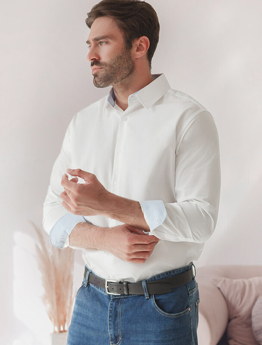 Классическая офисная белая рубашка из премиального хлопка с добавлением эластана идеально подходит для повседневной работы. Натуральный материал обладает дышащими свойствами, а эластан в составе обеспечивает правильную посадку на фигуре. Отложной воротник придает образу аккуратность, а манжеты на рукавах фиксируются пуговицами, позволяя регулировать степень облегания. Белый цвет подчеркивает строгость и свежесть внешнего вида — такой вариант легко сочетается с любым стилем, например, деловым или кэжуал. Прямой крой Classic-Fit делает рубашку практичной для мужчин разных размер, в том числе и больших, а так же комфортной при длительном ношении.  Беспроигрышные варианты — это сочетания с классическими брюками для делового стиля, а для повседневных образов можно использовать джинсы, брюки-чинос и даже шорты. Для завершения образа подбирайте обувь, соответствующие стилю: от лоферов и дерби до кед и кроссовок.