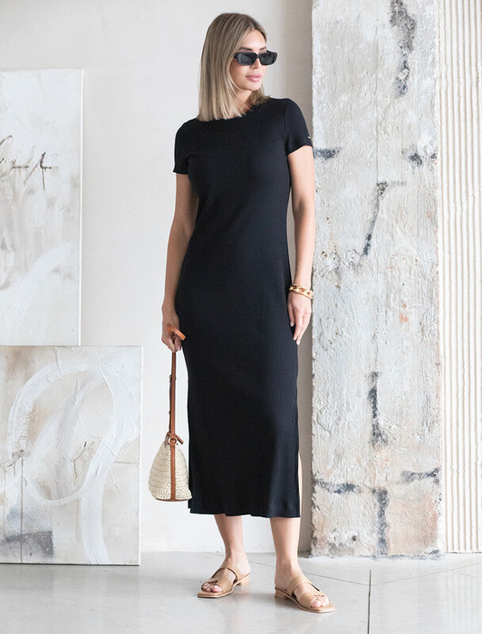 Платье выполнено из трикотажа в широкий рубчик. Модель дополнена высокими разрезами по бокам. Премиальное качество хлопковых волокон и наличие эластана в составе изделия способствуют идеальной посадке по фигуре не сковывая движений.  Изделие сохранит свой безупречный внешний вид в течении долгого времени.