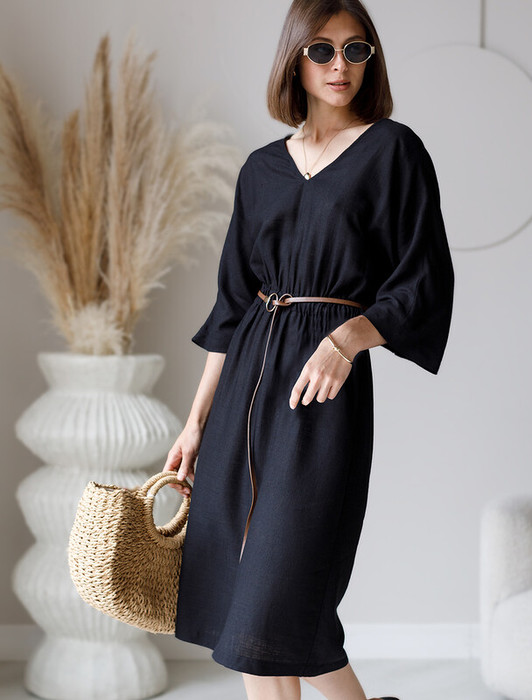 Платье выполнено изо льна с вискозой. Модель с V-вырезом и с цельнокроеным рукавом в стиле кимоно дополнено вшитым поясом из эластичной резинки. В комплект входит ремешок из эко-замши с золотистым кольцом. По бокам два кармана. Лён в составе обеспечивает прочность и воздухопроницаемость, вискоза эластичность и гладкость ткани. Благодаря такому сочетанию изделие хорошо драпируется, меньше мнется и сохраняет форму в течении долгого времени.
